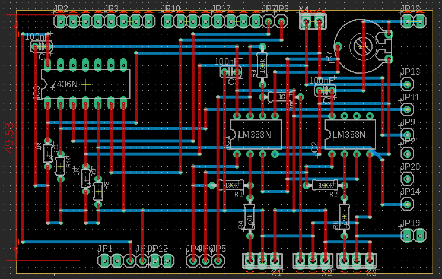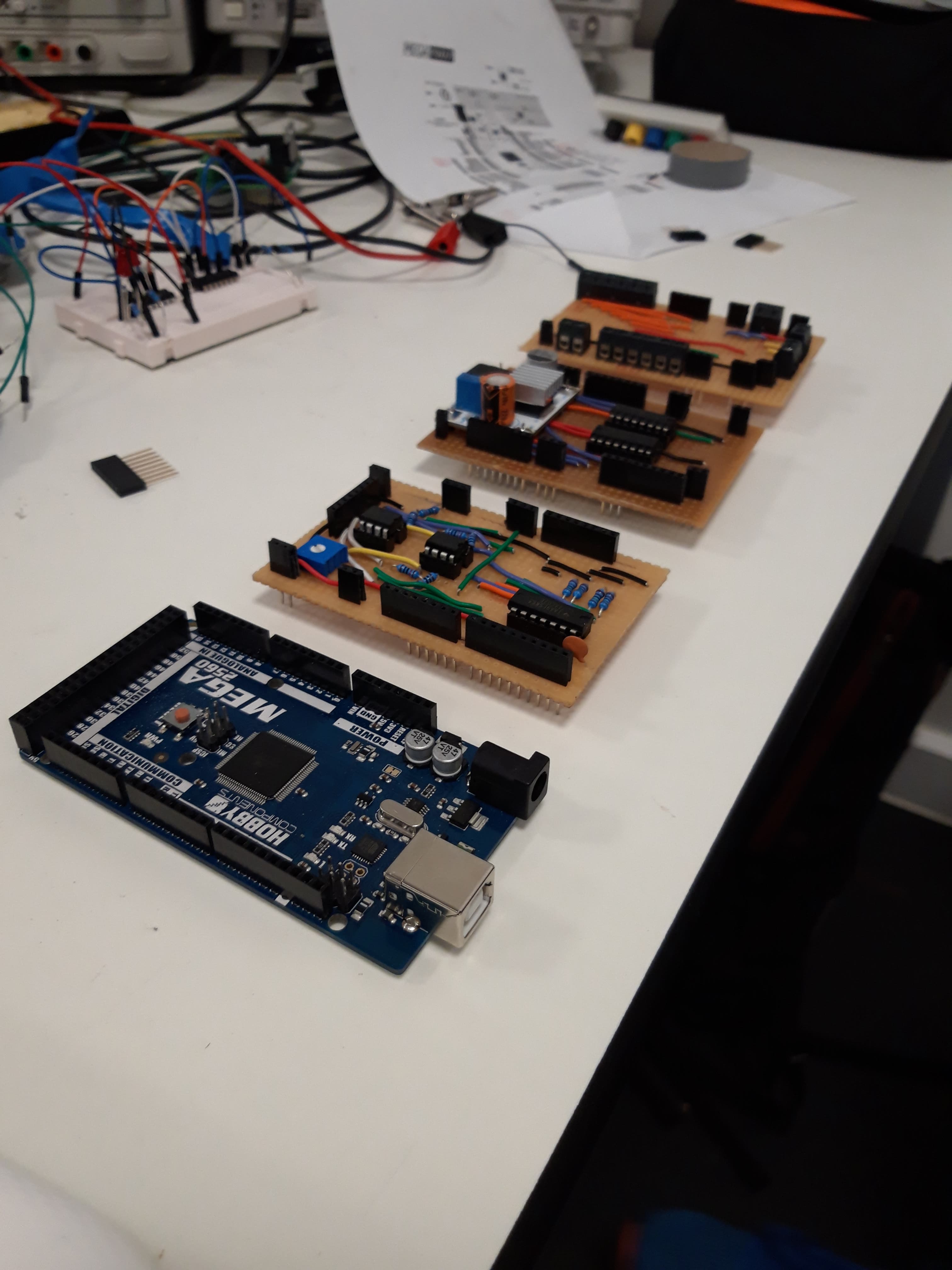 The PCB had to be constructed from strip board due to the time and budget constraints. In order to have the most size efficient layout, a design was used that stacked the boards on top of each other. This made it less likely for errors to occur from loose wires when removing the board from the gantry. The end result was 3 boards stacked on top of an Arduino MEGA.