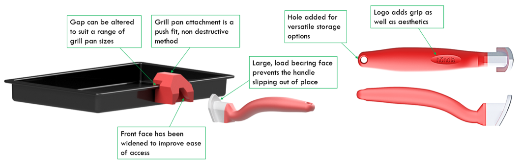 A focus was then placed on the handle design. Using anthropometric data, a profile that 95% of the population could grip was drawn. Previous feedback had shown that a curved handle made lifting easier so this feature was applied. Considering material use, silicon was the obvious choice for a product to deal with heat, this would also provide grip. A final modification was to add a thumb locator with the logo embossed for additional grip.