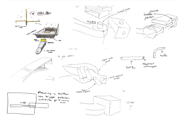 A large number of concepts were sketched and subsequently evaluated to narrow down on the best ideas, 6 of these were prototyped using foam and cardboard to present to the user for additional feedback. By watching how the user operated each concept we were able to test how intuitive each design was. Using a weighted scorecard a concept was selected: a detachable grill pan handle.