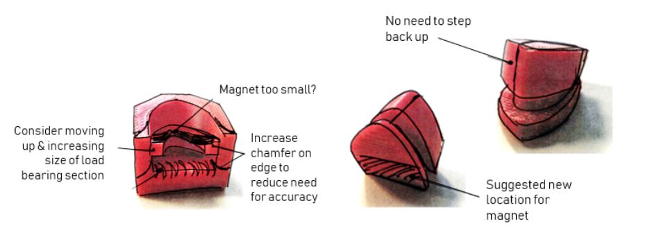 A method of integrating a magnet into the slot was designed using Inventor, in order to speed up prototyping, just the attachment mechanism was 3D printed. It was clear that this version was too bulky and an analysis was done to determine where material could be removed for the second iteration.