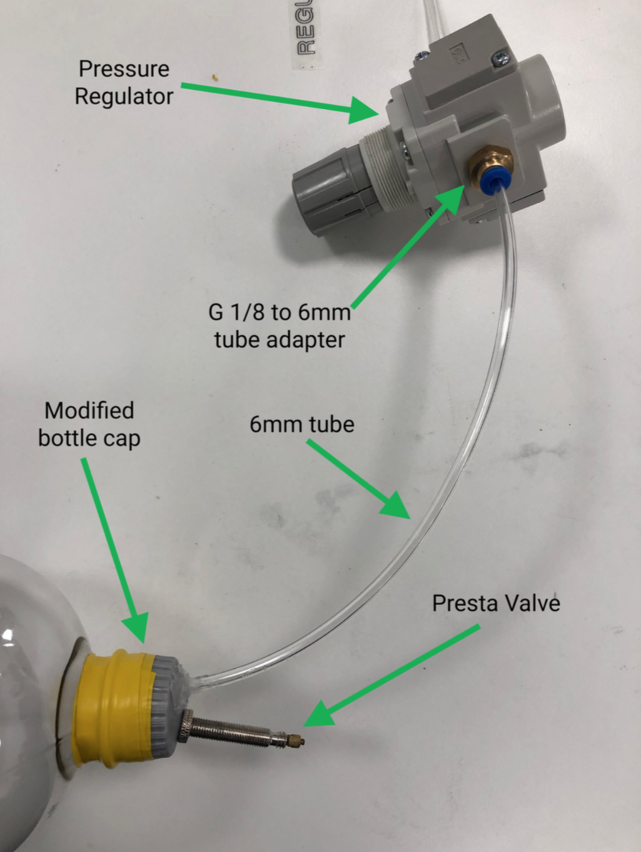 Using the international standard for a drinks bottle a cap was designed that could be fitted to either of the 2 threads in use. This had attachments for a standard bike valve, allowing a low cost pressure source.
