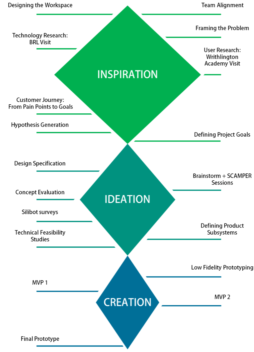 The first phase of the project consisted of a large amount of research, visits to schools and robotics laboratories gave the team an idea of what was required and products that already existed withing the chosen market. Following this research initial concepts were designed, individually at first followed by team sessions to expand and combine the ideas. At the end of this process the concept chosen was a Soft Robotics toolkit that would teach engineering design principles through the medium of soft robotics.